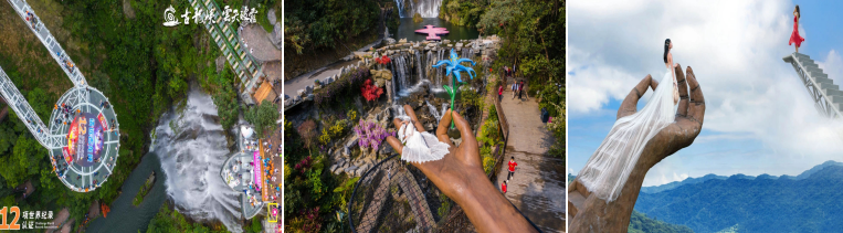 如不参加漂流可选择参加【古龙峡玻璃大峡谷:又名云天玻霸】(2选 1)是世界首个集玻璃平台、玻璃栈道、玻璃索桥为一体的高空观光玻璃组合,同时融入了5D破裂效果、玻璃悬廊、玻璃台阶、凌空微步等高空挑战产品。玻璃峡谷位于万丈崖大瀑布的顶端,目之所及,悬崖峭壁、飞瀑擎天。玻璃峡谷采用3层1.5厘米的超级透明玻璃,是目前世界上最厚的栈道玻璃,超白玻璃透光率99.15%。玻璃峡谷集玻璃云台、玻璃云梯、玻璃云桥于一体,总长度1314米,寓意着一生一世,在玻璃平面上总的步行时间约45分钟。从迈上玻璃平台,在高空步行520米,就到达了月牙桥。桥上两个巨大的心型雕塑,等待着情侣的山盟海誓。玻璃平台、玻璃栈道、玻璃桥几乎位于同一水平面,漫步其中,平步青云,犹如闲庭散步,俯视下方,却又步步惊心。