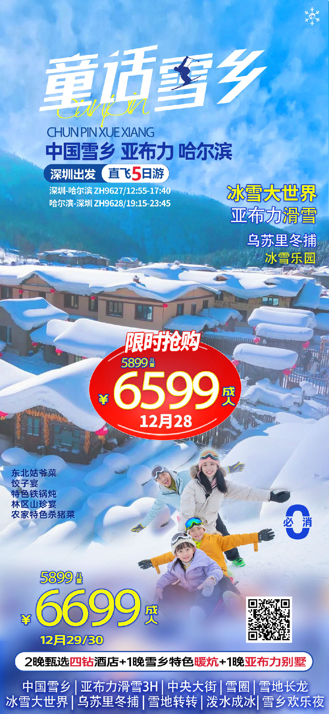 【国内】激情亚布力+万科双滑雪、梦幻雪乡、哈尔滨一天自由活动7天6晚双温泉订制游 深圳广州往返